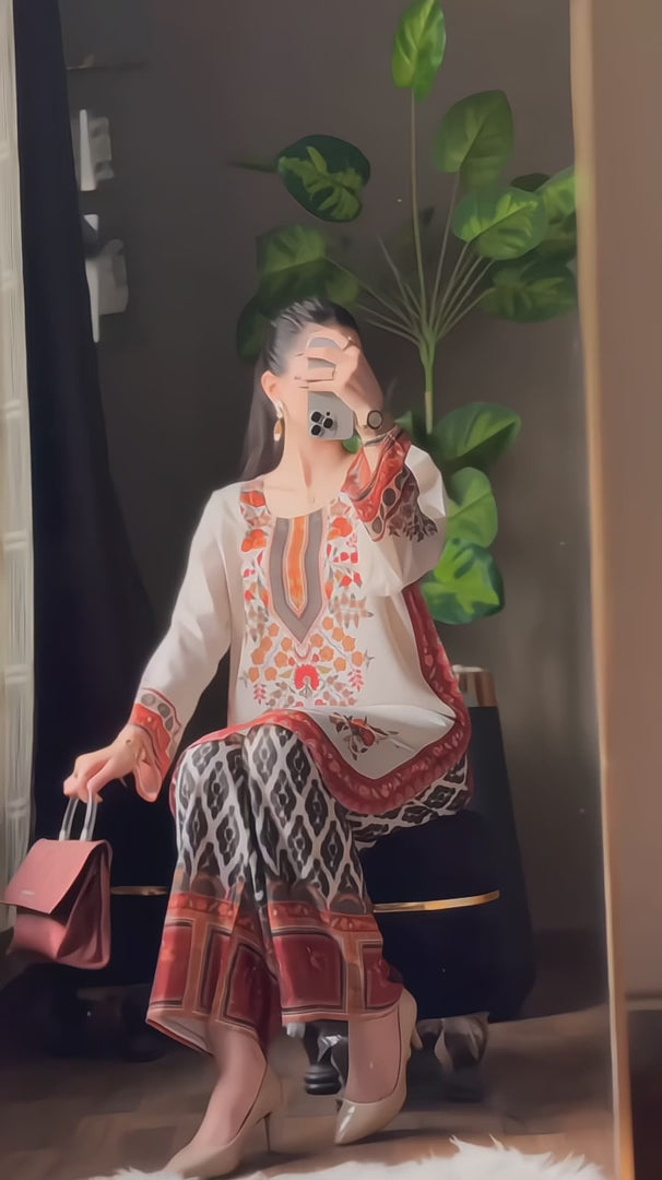 Detail: Intricately embroidered shirt on a soft beige base, paired with patterned trousers featuring vibrant border detailing